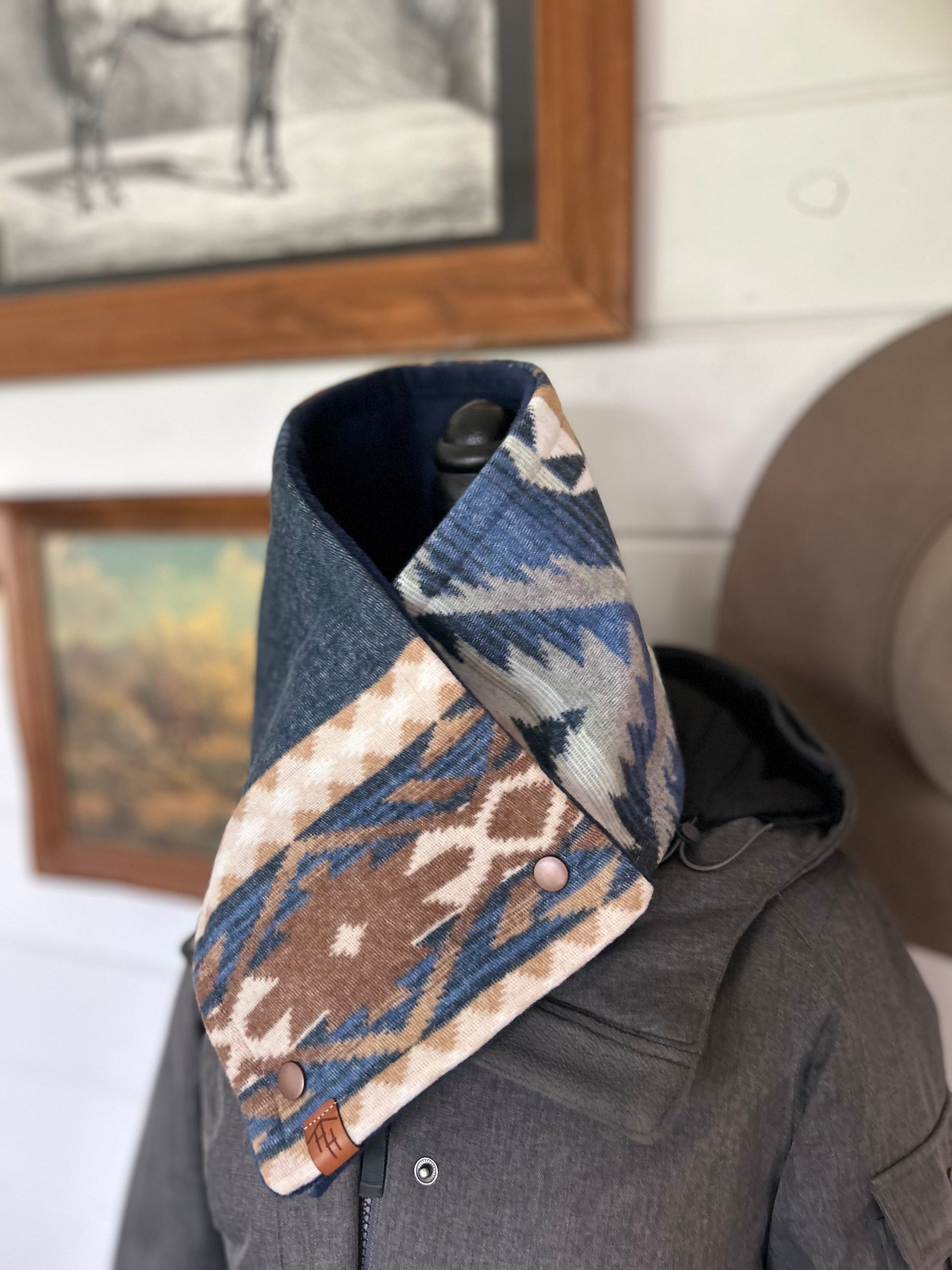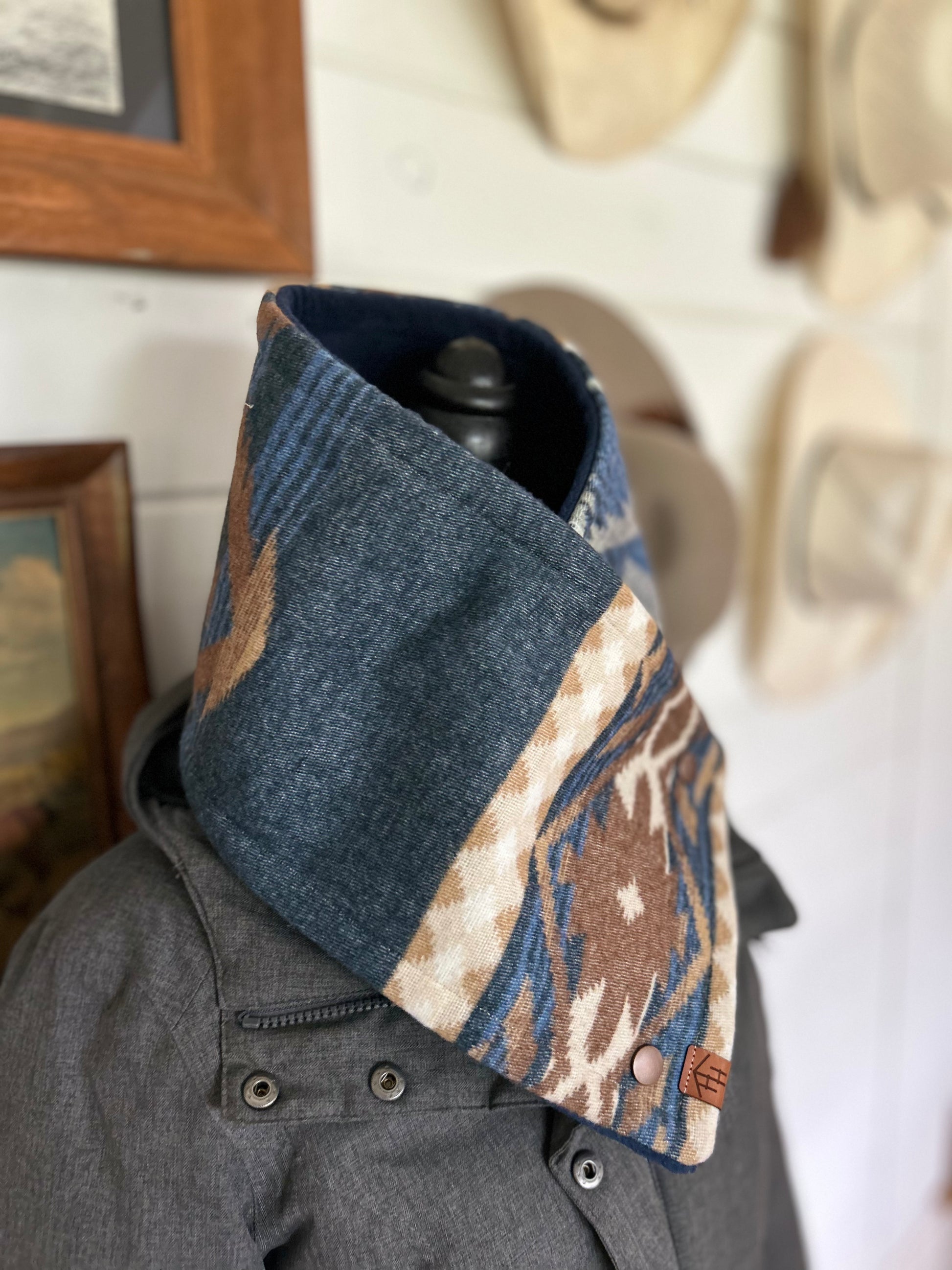 Love the warm and cool tones in this cowl, beautiful pattern variation makes for movement in the fabric! Deep blue fleece liner.